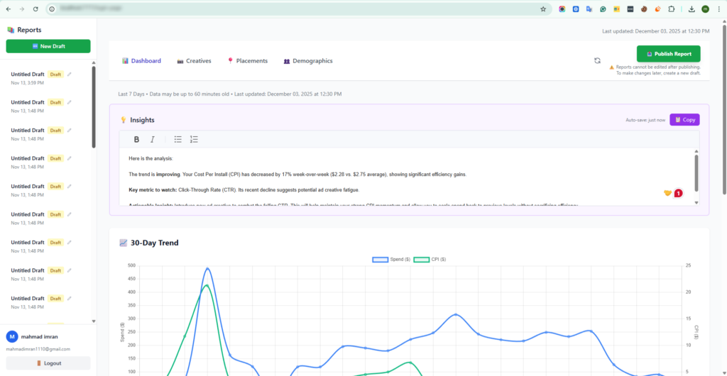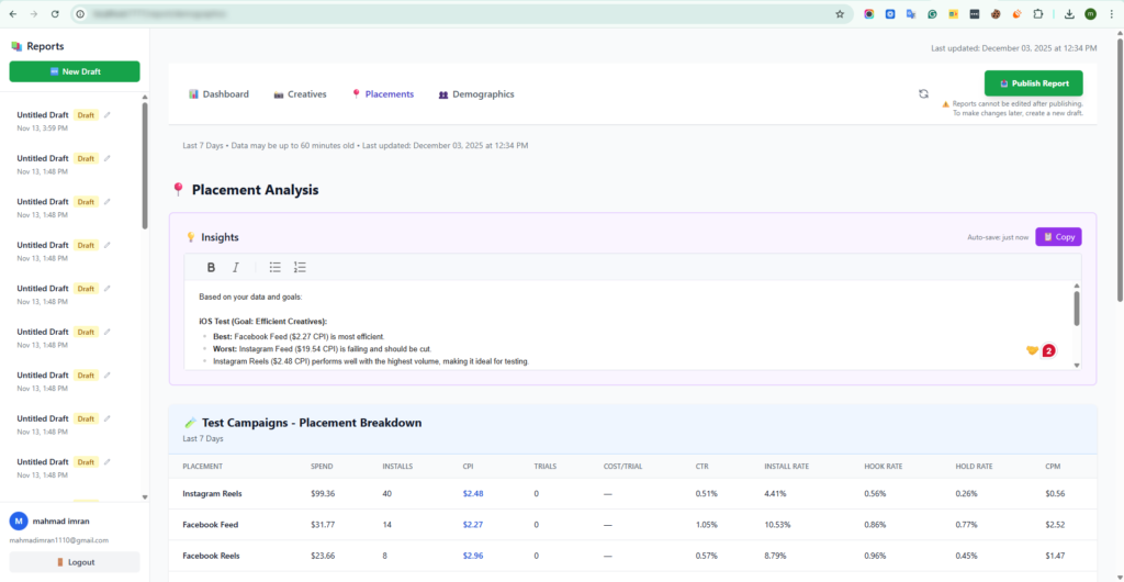 The Photo Vault Dashboard is a specialized analytics platform built to track, visualize, and optimize digital advertising performance—primarily focusing on Meta/Facebook ad campaigns. The platform consolidates key performance metrics, creative insights, placement effectiveness, and demographic data into a single, easy-to-understand interface, enabling marketers to make informed, data-driven decisions.