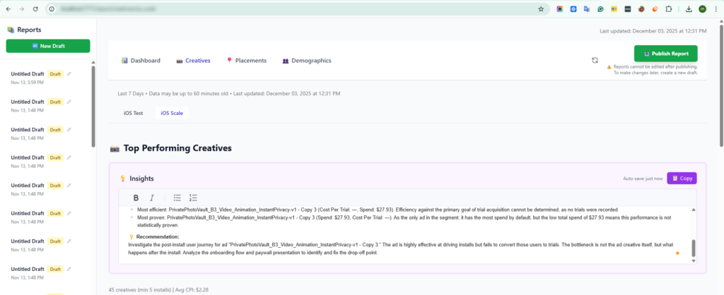 The Photo Vault Dashboard streamlines the complex process of analyzing and optimizing digital advertising campaigns. By centralizing key performance metrics, creative insights, placement data, and demographic information into an intuitive interface, it enables marketers, media buyers, and creative strategists to make fast, informed decisions. With robust filtering, detailed creative comparisons, and actionable visualizations, the platform empowers users to identify high-performing ads, optimize spend, and target audiences more effectively. Ultimately, the Photo Vault Dashboard transforms raw ad data into clear, strategic insights, helping teams maximize campaign performance and drive measurable growth.
