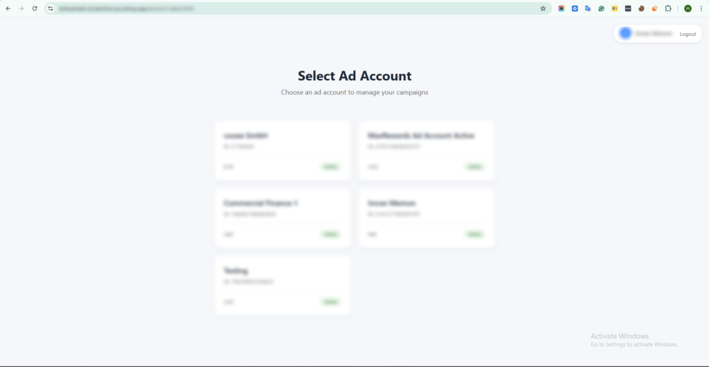 After authentication, users select the target Ad Account before launching ads. This guarantees all ads are created in the correct business environment, reducing operational errors.
